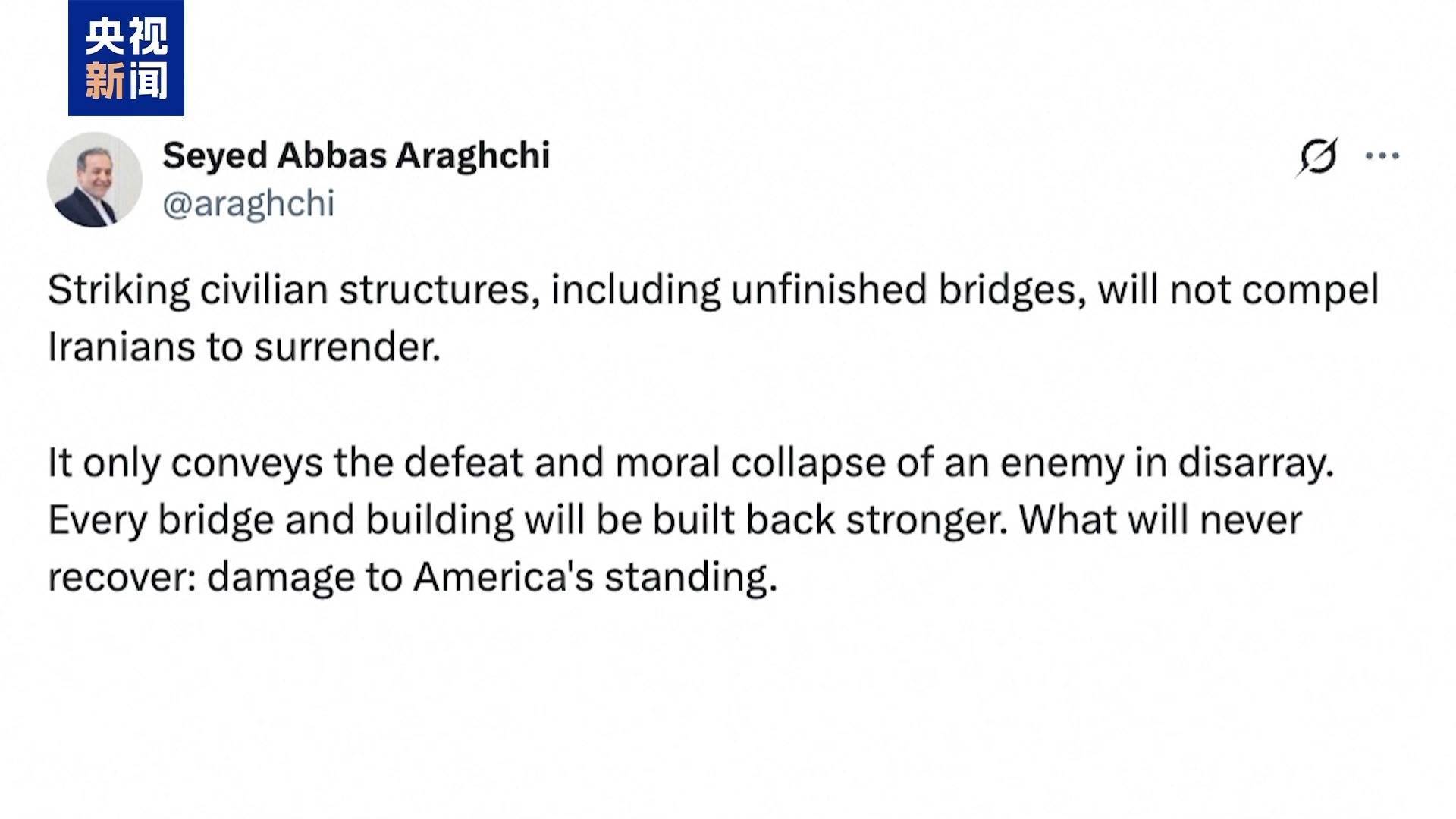 伊朗外长阿拉格齐回应说,破坏民用设施,包括未完工的桥梁,并不能迫使伊朗投降。